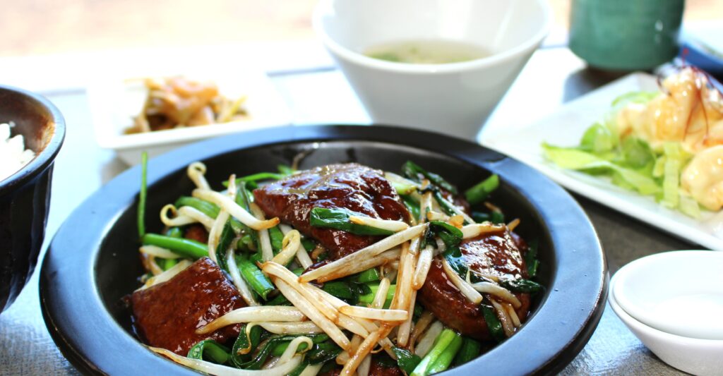 | 牛レバニラ炒め定食 (エビマヨ、中華スープ、搾菜付) ¥1,870(税込) |