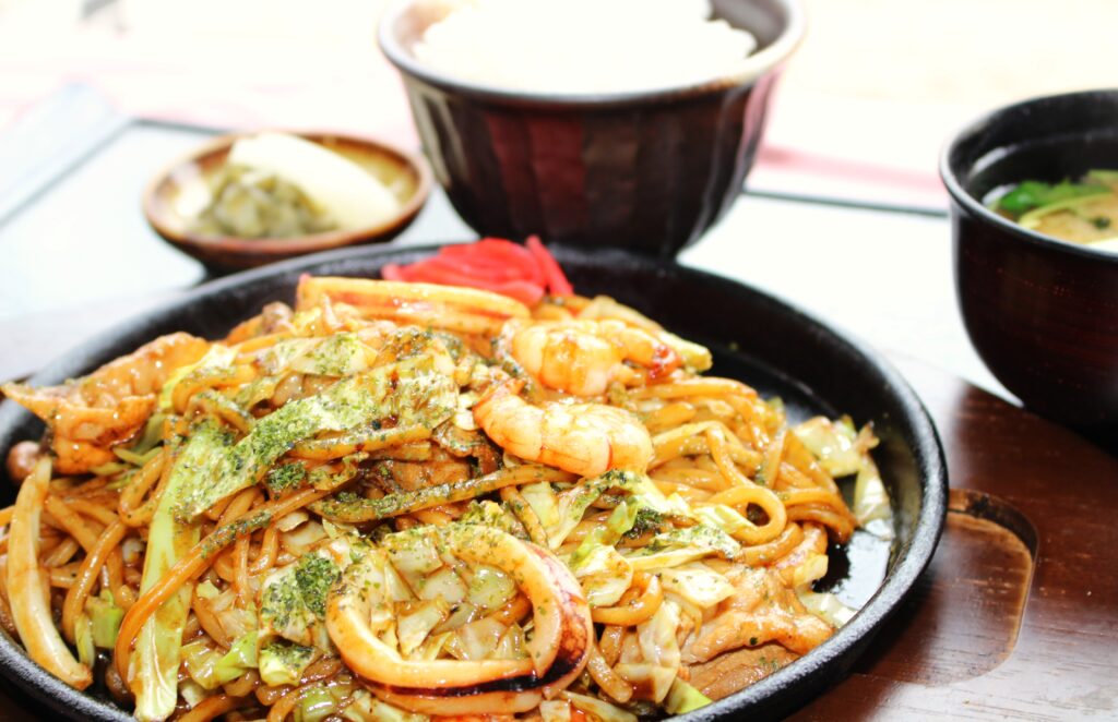 昭和24年創業 大阪名物お好み焼の名店 大阪天満『千草』監修の鉄板焼きそば。独特にブレンドされた濃厚ソースと麺が絡み合い、豚・海老・イカ等が入った『千草』監修の鉄板焼きそばが北六甲で味わえます。